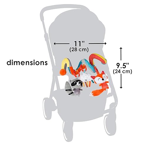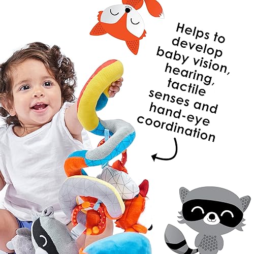 KEEP THEM ENTERTAINED ON THE GO - Vibrant and multifunctional sensory toy with hanging rattle, squeaker, crinkle paper and tactile ribbons