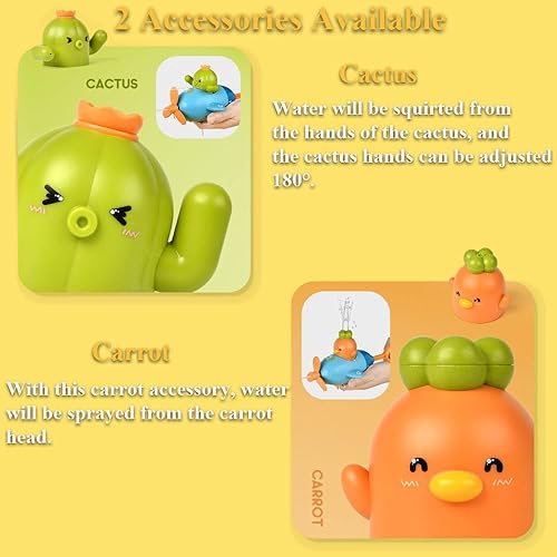2 Accessories Available: The water cannon bath toy comes with 2 lovely accessories that can be replaced easily. One is the cactus: (Water will be squirted from the hands of the cactus, and the cactus hands can be adjusted 180°.); another one is the carrot: (With this carrot accessory, water will be sprayed from the carrot head. )