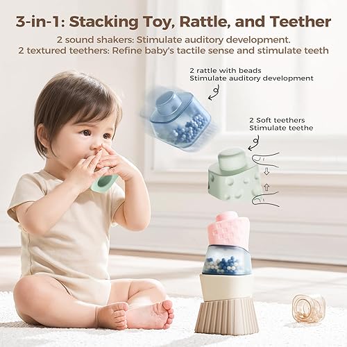 【Perfect Use as Teethers & Rattles】: This block set includes 2 soft teether blocks with different textures, which help develop sensory abilities while stimulating teething. 2 clear rattle blocks with colorful beads, allowing baby to connect the sound to sight