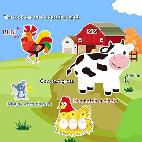 Farm themed busy book: This busy book for toddlers 1-3 shows children farm scenes such as animals being fed, crops being picked, tractors carrying grain, grain being put in the barn, and hens laying eggs. With these fun interactive game, the activity book keeps little hands & mind busy and engaged