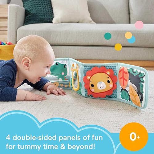 Soft activity toy with 4 double-sided discovery panels featuring high-contrast black & white patterns, bright colors, and friendly animal pals