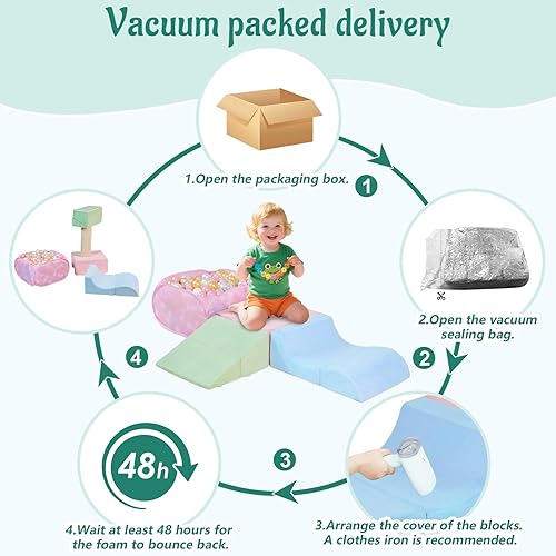 Easy to Clean/Setup: This soft play is made of soft high density foam, suitable for infants to climb and explore, there is a certain degree of safety. And the soft slipcover has zippers that makes it easy to remove and machine wash. Foam blocks compressed in a box. When the package is opened, this foam crawl set will be deformed and thin due to compression packaging. Don't worry, once unboxed the climb and crawl playset, please wait 48-72 hours for full expansion