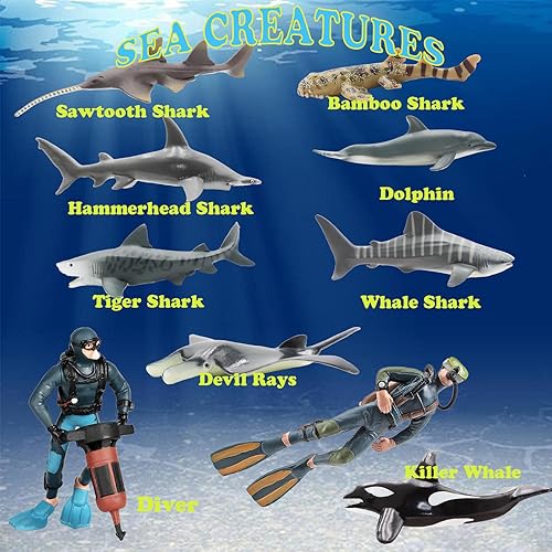 Shark Toys Divers Set: Our 8 pack includes a variety of sharks with 2 Divers: Whale shark, Sawtooth shark, Bamboo shark, Tiger shark, Killer whale, Hammerhead shark, Devil rays, Dolphin.