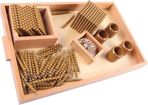 This set includes 100 unit beads, 45 bars of 10, 9 squares of 100, 1 cube of 1000, 2 wooden boxes, 4 brown cups and a wooden tray to house the set. This set is a concrete representation of the decimal system from 1 to 1000, demonstrating place value and the concept that a decimal category cannot exceed nine.