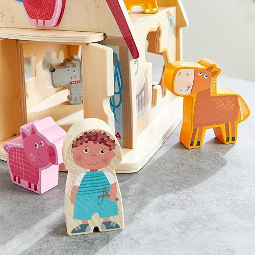 SHAPE SORTING FARMHOUSE FUN: This wooden sorting toy helps toddlers match six farm animals to their correct slots, enhancing shape recognition, problem-solving, and fine motor skills.