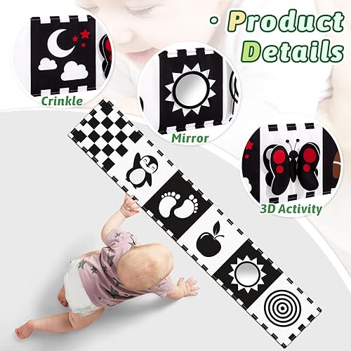 High Contrast Visual Stimulation: Features crinkle paper, sound elements, a hidden flower, and a baby-safe mirror to engage and stimulate visual and sensory development.