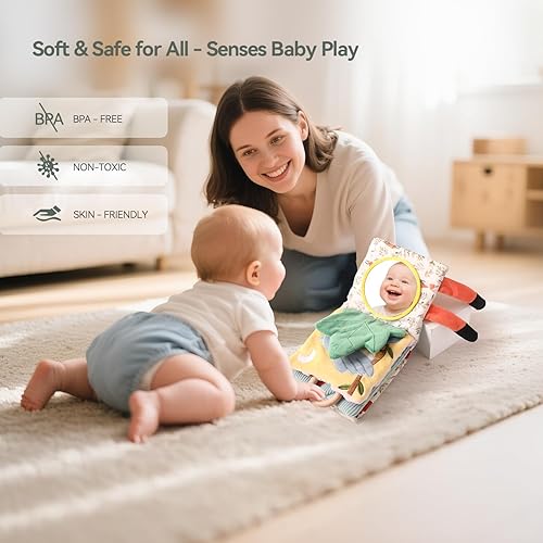 PROMOTES MOTOR SKILLS EFFECTIVELY: Designed as a tummy time essential, the book's graphics and textured surfaces motivate prolonged play. The built - in mirror fosters self - recognition, while crinkle elements engage babies to lift their heads and strengthen neck muscles