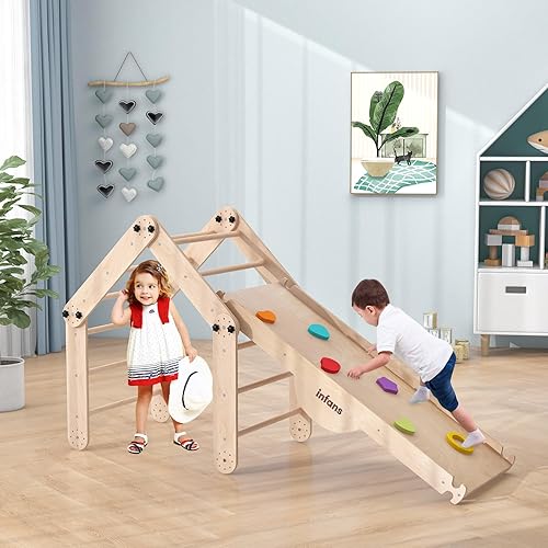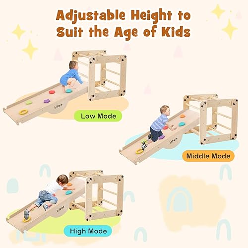 Upgraded Climber Set with 7+ game modes: INFANS modifiable climbing toys include a cube ladder and a ramp climb. By adjusting the height of the round sticks and wooden planks, the triangle climber ladder can be arbitrarily changed into a climbing toy of different heights and shapes. This versatility adds value to your purchase, as it serves multiple purposes and grows with little one.