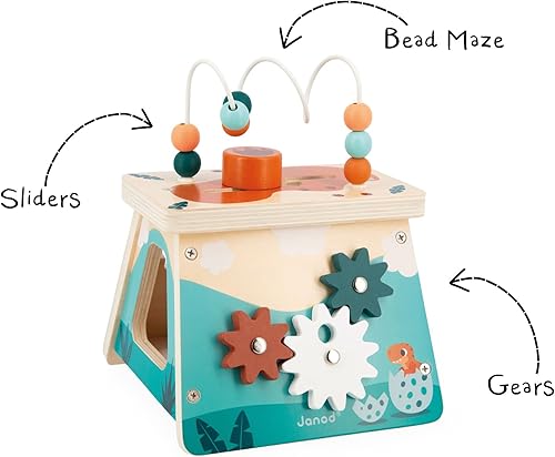 Ideal Early Learning Toy: With 5 fun activities, this cube is ready to help your child learn motor skills, dexterity, and cause and effect. Slide the beads, push the dino track, spin the gears, or give the mirror your best dino roar. Measures 8.26”x 6.29” x6.29”.