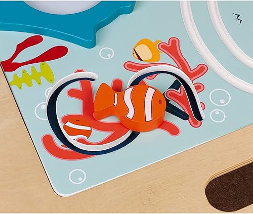 RECTO SIDE, 5 PREMIER GE ACTIVITIES: On the front side of the board, the child can play with the stackable lighthouse, the boat circuit, the 3 drums with 2 crab sticks, the 4 octopuses gear or with the fish back and forth to slide. With the 5-in-1 play table, the child can develop motor skills and stimulate their imagination!