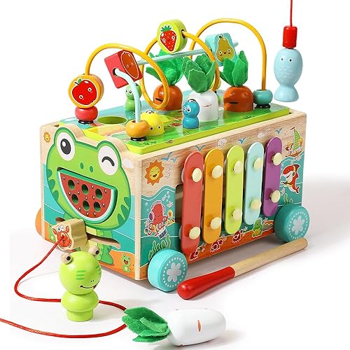 TODDLER MONTESSORI EDUCATYIONAL TOY - Carrot harvest, fishing games, frog catching worms game - exercise children's imagination, hand-eye coordination. Bead maze game - exercise 1 2 3 years old children's brain power. Color shape building block maze - train kids’ color and shape recognition. The crab alarm clock - teach children to recognize time and numbers. The xylophone toy - can make a pleasant sound when struck. Syllables, bright and light musical sounds can quickly attract children's attention, and look forward to your children becoming little musicians!