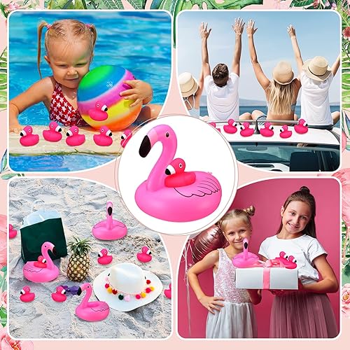 Ideal Size: each flamingo bath toy measures approximately 2.76 x 2.36 x 2.17 inches, and comes with a flamingo swimming ring with a diameter of 7.9 inches and a height of 6.9 inches; The flamingo rubber duck can be placed on the swimming ring to make it a fun pool, birthday party decoration