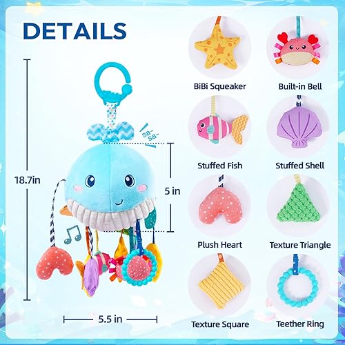 Motor Skills Toys: The whale design of the pull string hanging toy makes it more easier for the baby to hold. Pull the different textured plush stuffed from side to side to hear and feel the various sounds and vibrations. Promote the baby 0-3-6-12-18 Months to develop fine motor skills and hand-eye-brain coordination