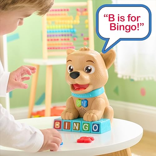 Learn and Play the CoComelon Way: Inspired by the hit CoComelon preschool series, the CoComelon Count & Learn Bingo toy helps kids learn letters, colors, spelling, numbers, and music. Push buttons and feed colorful treats to Bingo to learn and play!