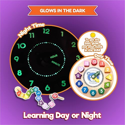 TELLING TIME MADE EASY | The wooden clock is inspired by Montessori learning! There are so many things to learn. Learn the hours and minutes of the time clock, learn 12 different shapes and 12 different colors. Develop your fine motor skills along the way by lacing the wood beads and taking the clock into a dark space to watch it glow.