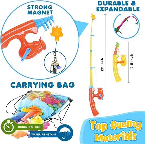 Contain large and cute sizes, more than 10 colors, 31 toy fishes animals and wind-up turtle. 2 poles, 2 nets, water-proof carrying bag, and colorful packaging bag. Best for kids ocean animal learning party!