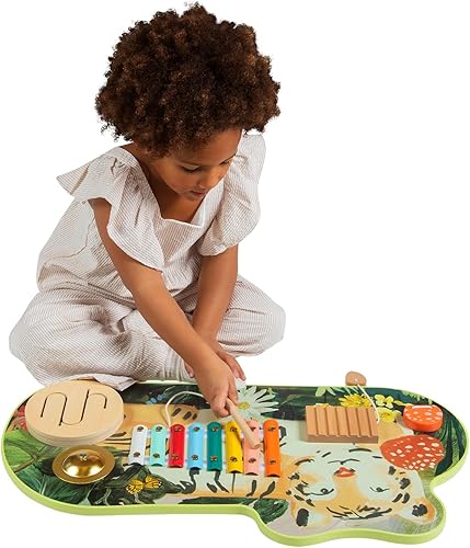 MUSICAL EARLY LEARNING TOY: The wooden Tiger Tunes toddler and preschooler toy embodies five instruments: an 8-key xylophone, a wooden drumhead, metal cymbal, mushroom clacker, and washboard sound maker. Attractive as nursery wall decor, music set for kids features artful illustrations and a tethered-on wood pick and mallet.