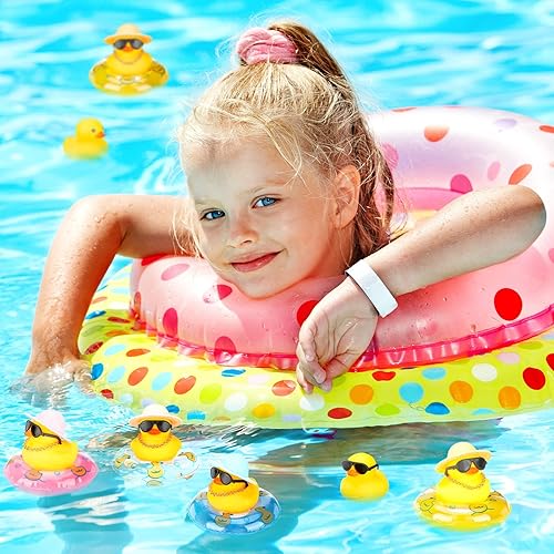 Summer Rubber Ducks: you can receive 24 mini ducks, each is about 2 inches, 24 mini hats, 24 mini black eyeglasses, 24 mini golden necklaces and 24 mini swimming rings, 120 in total; The mini hats, black eyeglasses, necklaces, swimming rings and ducks are separate, you can put the sunglasses on these ducks, which are nicely matching, delicate and lovely, especially designed for little hands, comfortable to hold and fun to play