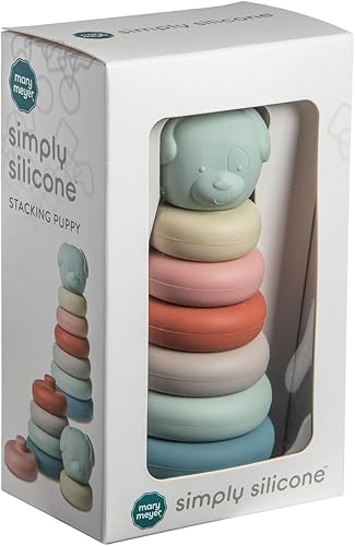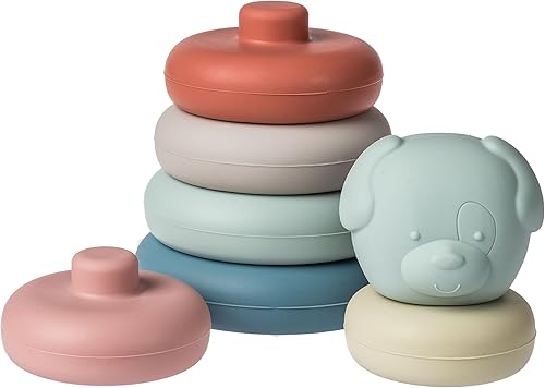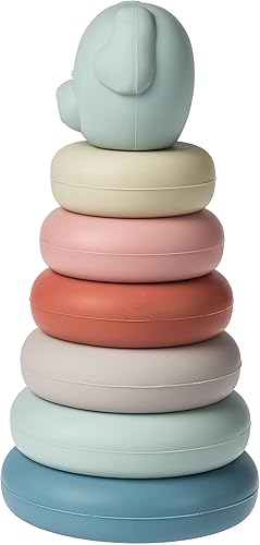 STACKING TOYS: Classic stacker toy includes 6 silicone rings and adorable puppy face topper, all in soft subtle colors