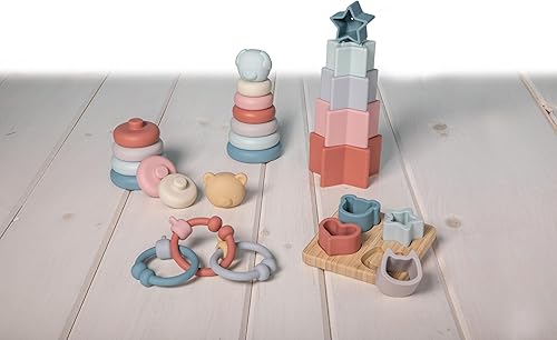 6 MONTHS & UP: Ideal for little hands to grasp and stack, silicone is soothing to chomp and chew on, fun sensory toy for exploration