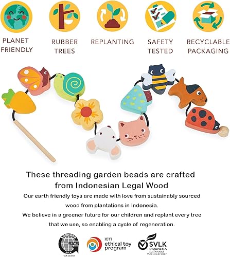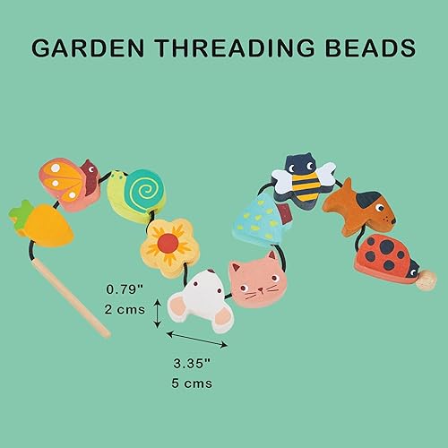 WHERE QUALITY MEETS IMAGINATION - Crafted from durable and sustainable wood, our Garden Threading Beads set is built to withstand enthusiastic play while offering hours of educational fun. The toy comes with a black chord with a dowl end and 10 garden themed pieces for threading. Dimensions 22.44 x 1.97 x 0.79 inches.