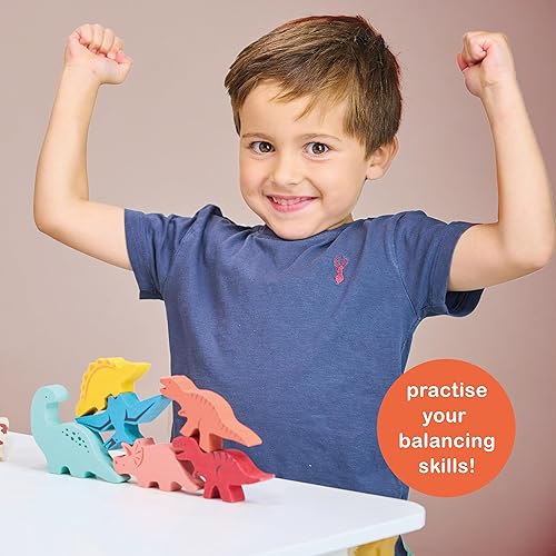 Mentari Toys - Happy Stacking Forest - 8pc Wooden Stacking Toy for Toddlers - Colorful Nature Theme Balancing Activity Toy with Bag - Boost Fine Motor Skills and Dexterity - Educational Toy - Age 18m+(Dinosaurs)