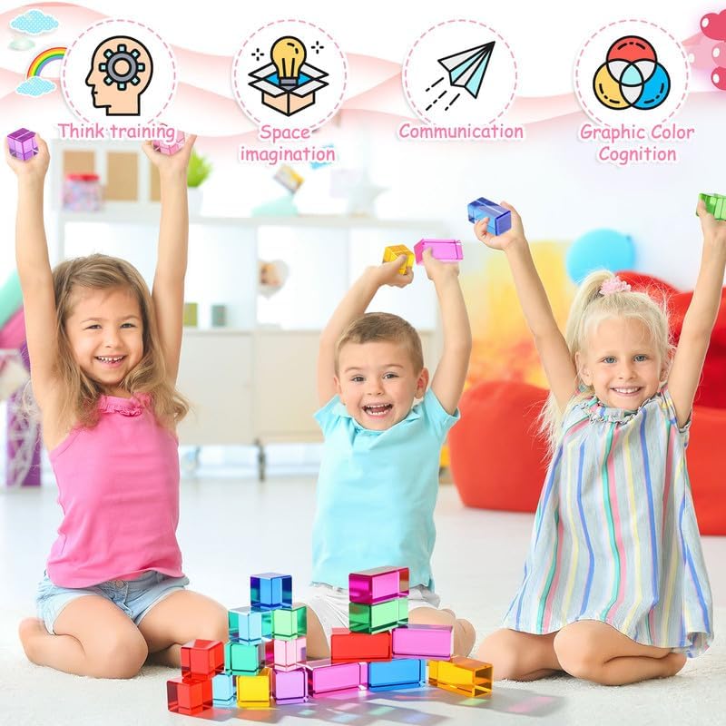 Beautiful Teaching Aids and Toys: rainbow acrylic cubes are in bright and vibrant colors; When exposed to light, they glow brilliantly, creating a brilliant visual effect; When paired with a light table or window front with natural light, their colorful shadows will give you s surprise; Acrylic cubes are both beautiful and inspiring for boys and girls