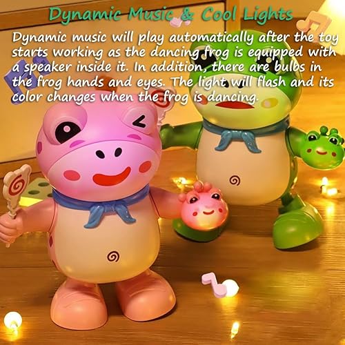Dynamic Music & Cool Lights: Dynamic music will play automatically after the toy starts working as the dancing frog is equipped with a speaker inside it. In addition, there are bulbs in the frog hands and eyes. The light will flash and its color changes when the frog is dancing. (Music can be turned alone)