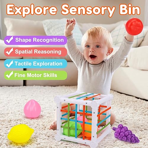 Early Learning Shape Sorter Bin: Our shape sorter toys for babies 6-12 months with different textures, colors, shape. Easy to clean and hold. Help babies explore textures and work on fine and gross motor skills. Perfect 8 9 10 11 12 month old essentials toy, infant toys 6-9 9-12 months developmental,toys for 1 year old girl boy learning toys,toys 6-12 months.