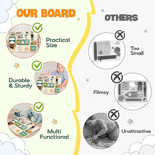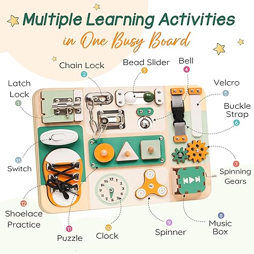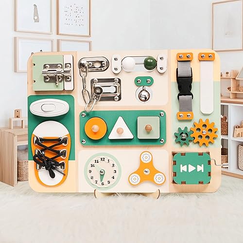 【Montessori Busy Board for Toddlers 1–3】This wooden busy board includes 13+ Montessori-inspired activities to help toddlers explore, learn, and practice basic life skills. Perfect for early learning and sensory play at home or on the go.