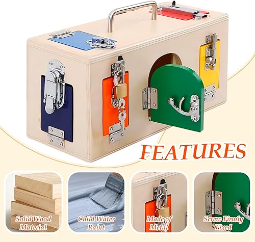 Montessori Wooden Busy Box: Our lock and key toy set are a good choice for parents to give to your toddlers. Kids lock box includes 10 brightly colored doors, each with a unique lock, allowing babies to learn multiple ways to open, close, and unlock doors while playing with lock toy set. This is an interesting process for boys and girls