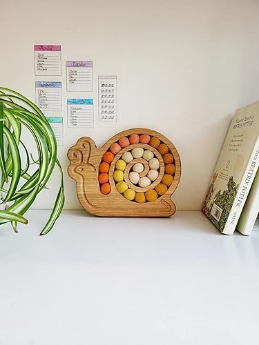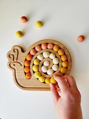 MATERIAL - Natural wood - oak. Size: Snail 21*16*2cm or 7.5*6.3*0.8 inches Felt balls 2,5cm or 0.9 inches. Price per snail and 28 felt balls(+2 additional) in linen bag.