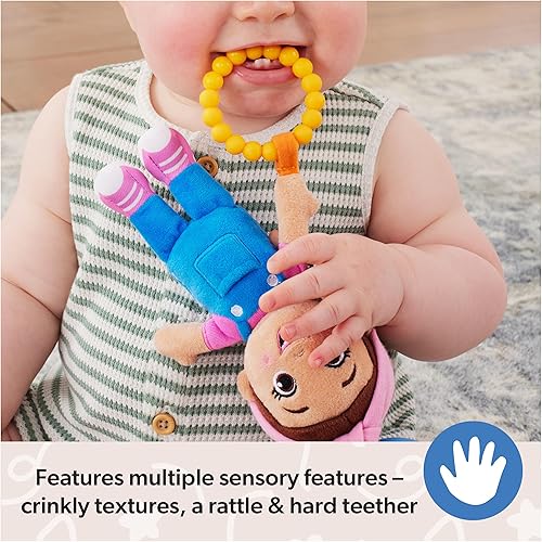 OFFICIAL MS. RACHEL SENSORY TOYS: Features Ms. Rachel's likeness & multiple sensory features to stimulate early development: crinkly textures, a rattle & hard teether for teething relief in babies 3+ months