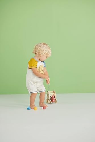 Wooden pull toy on wheels features spinning shape sorter body and five wooden shapes