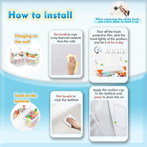 【Multi-Scene Usage】 This bath toy holder offers versatile storage solutions—hang it on the wall or corner with included hooks, or attach it to the bathtub using suction cups.No longer confined to a single method of use!