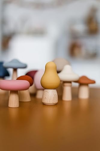 These mushrooms are a hit! A silicone & wooden toy featuring a variety of sizes, pieces, and colors that can be taken apart and interchangeable.