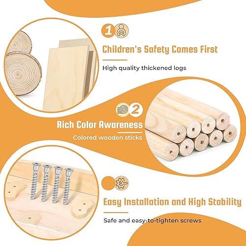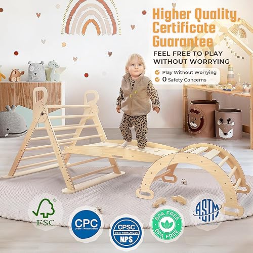 SAFE AND STABLE WOODEN TODDLER CLIMBING TOYS: Our Montessori climbing toys are made of 100% natural solid wood to ensure safety and environmental sustainability. Once assembled, the overall structure is very stable and the surface is smooth and burr-free, creating a perfect and safe indoor play environment for your baby. And we have added an extra anti-tip bar at the bottom of the triangle ladder to further improve stability and ensure safety when climbing.