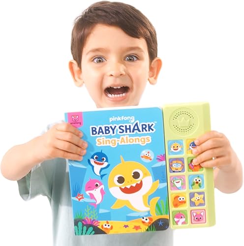 OFFICIAL PINKFONG BABY SHARK BOOK that plays the iconic Baby Shark song (doo doo doo doo doo)! Our premium 10 button sound book that features 10 press-play buttons, 9 full singing songs (+ bonus Pinkfong stinger sound), and 16 colorfully illustrated pages with lyrics on non-glaring, highly durable pages.