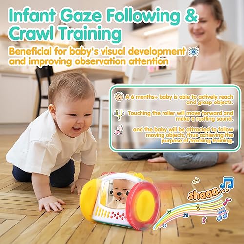 Rolling Baby Mirror Crawling Toys 6-12 Months - Safe infant mirror for imitation, the mirror always keeps the mirror face facing the baby while rolling, attracting baby's attention and promoting visual development. The rolling design is baby crawling helper, to help strengthen baby's leg and arm muscles. A real ideal baby toys to encourage crawling.