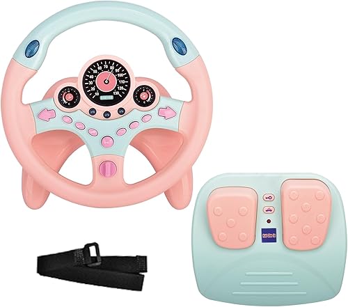 EASY TO USE: This toy steering wheel, with suction cups under the base, can be sucked on tile walls and desktops. It also comes with a foot brake device, you can easily bring it to the car and strap the steering wheel to the driver's seat, so that your baby and you can enjoy the fun of driving together