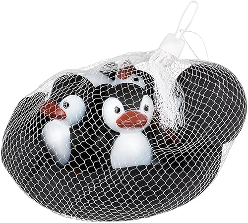 4-piece bath play set Each set in netted bag 1 large penguin holds 3 baby penguins Perfect bath time toy Nontoxic, led-free paint Phthalate-free PVC One set per unit Ages 3+