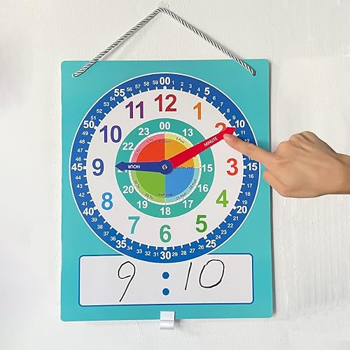 Features: Comes with a hanging rope and magnet stickers, which can be easily hung on the blackboard or wall, or attached to a refrigerator or iron plate. The movable hour and minute hands can adjust the time at will. The erasable pen can record the time of the presentation. It can be used as a teaching aid for time teaching, or as a decoration at school or at home.