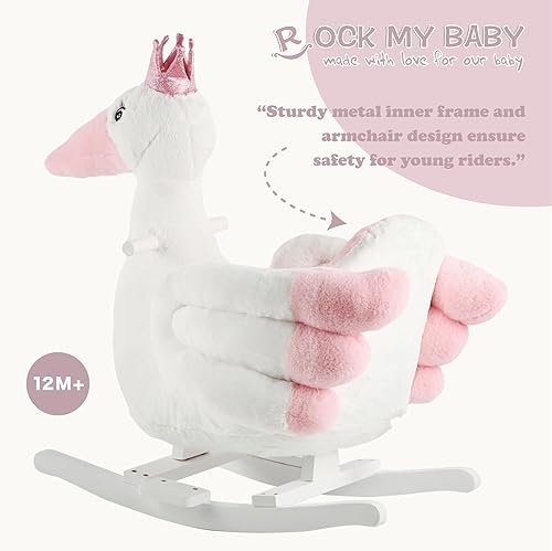 Sturdy and Safe Materials : This plush rocking horse is made of very soft fabric and 3-sided seat with solid wood rails, sturdy metal construction and soft polyester padding, which is very safe for your baby to sit in.