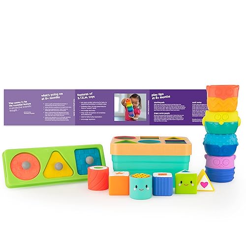 12 Piece Set designed for open-ended STEM play allowing for baby to experiment and play in multiple ways, with play guide