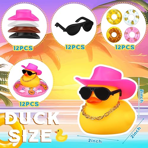 Lovely Duck Decorations: you will get 12 pieces of funny rubber ducks, each measures about 2 inch, equipped with mini hats, swim circles, necklaces and sunglasses; The ducks have interesting shapes and are suitable for decorating cars, offices, bedrooms and desks to add some fun and relieve your stress