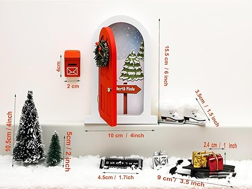 Magical Mini elf door Set has everything to build a tiny Christmas elf back scene,1*elf door (opens ,with a backgrand stricker) 1* red Sante malbox perfect for elf messages ,1pc 5cm Christmas tree 1 pc 10cm Christmas tree 1*Sante hat 1* miniature wood sled 1 pair of skate 1 *welcome door mat,3 pcs Christmas present box 1* wreath