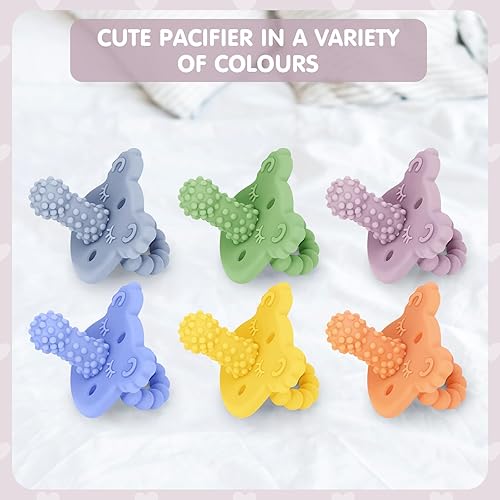 6-PACK OF PACIFIERS: The package contains 6 teething pacifiers in different colors: blue, green, yellow, orange, grey and pink, ready to be used as a spare when the pacifier is lost. Our teether pacifier is cute and fun, great baby gift for boys or girls.