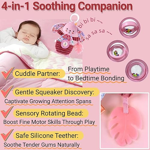 VERSATILE USE: Spiral Car Seat Toys for Infants 0-6 Months Girl Boy: Flexible spiral safely positions hanging carseat toys bunny within reach; Attach securely to girls baby carseat toy and stroller toys; Great travel toy for baby girl car seat