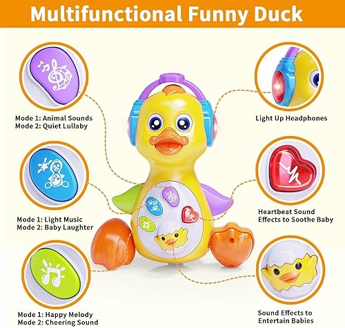 Developmental Infants Toys : The colorful buttons help to hone finger dexterity, Montessori toys develop fine motor skills. Imitating and chasing the musical duck can exercise baby's limbs large motor skills. The duck can enhance baby's interaction ability, the music and animal sounds can teach your little one about rhythm.