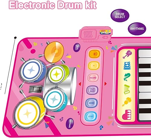 【Baby Educational & Learning Toys】Music learning toys for 1-2 year old are perfect for developing your baby musical interest. As they listen to music, they'll be inspired to sing and dance, improving their language skills and hand-foot coordination. Fostering creativity, and promoting exercise at an early age. Drum side improves hand-eye coordination and finger flexibility while striking. Piano Play Mat is designed to nurture your child's musical talent and develop basic musical skills.